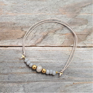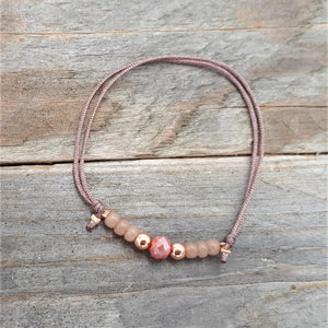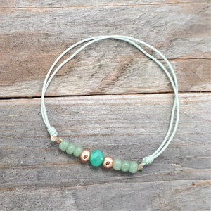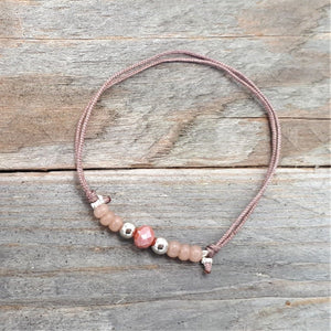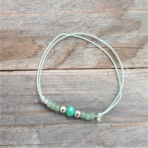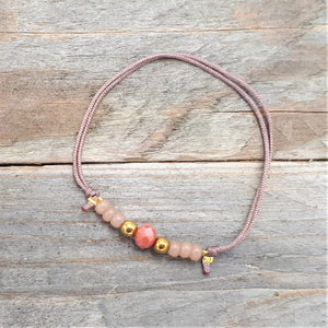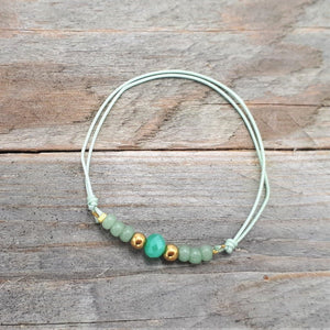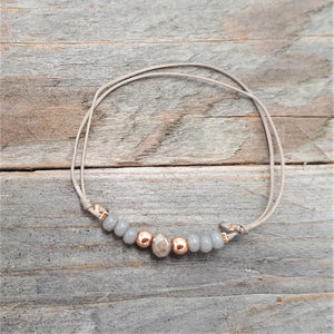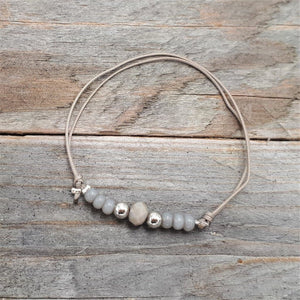 Das Armband BOHO II ist aus Glasperlen und synthetischen Hematit-Perlchen auf Satinseide aufgezogen. Es schmiegt sich leicht und angenehm um das Handgelenk und ist durch den Schiebeknoten größenvariabel.