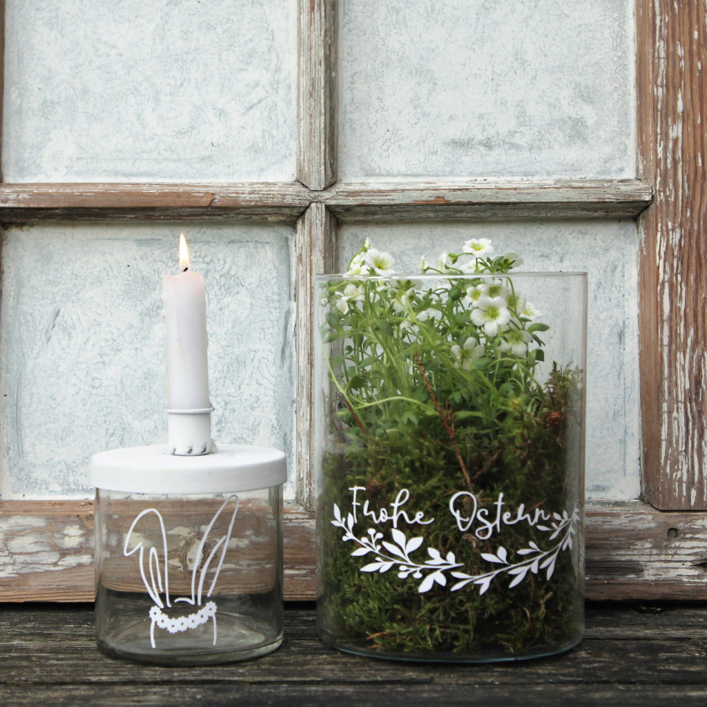 Unser Stickerset HASENOHREN lässt sich wunderbar auf Vasen, Laternen, Windlichter, Fenster, Türen, Glasrahmen und vieles mehr anbringen. Die Oberfläche des Stickerset HASENOHREN ist matt und wurde speziell für Dekorationen im Innen- und Außenbereich entwickelt. DAS Stickerset HASENOHREN ist für die Anbringung auf ebenen Untergründen geeignet und lässt sich wieder rückstandsfrei entfernen. Auch auf leicht abgerundeten Untergründen kann der Sticker verklebt werden. Vor der Verklebung muss der Untergrund frei von Staub und Schmutz sein und sollte mittels Spiritus gereinigt und trocken sein. Die Haltbarkeit der Aufkleber im Außenbereich beträgt bis zu 3 Jahren, im Innenbereich ist sie nahezu unbegrenzt haltbar. Es ist nicht Spülmaschinen geeignet.