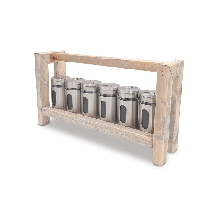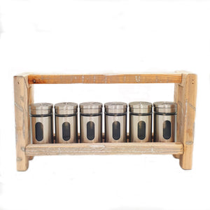 Dieses Gewürzregal TREIBHOLZ kommt im Set: 6 Gewürzgefäße und ein Regal. Einfach praktisch zum hinstellen und sieht dabei noch gut aus.