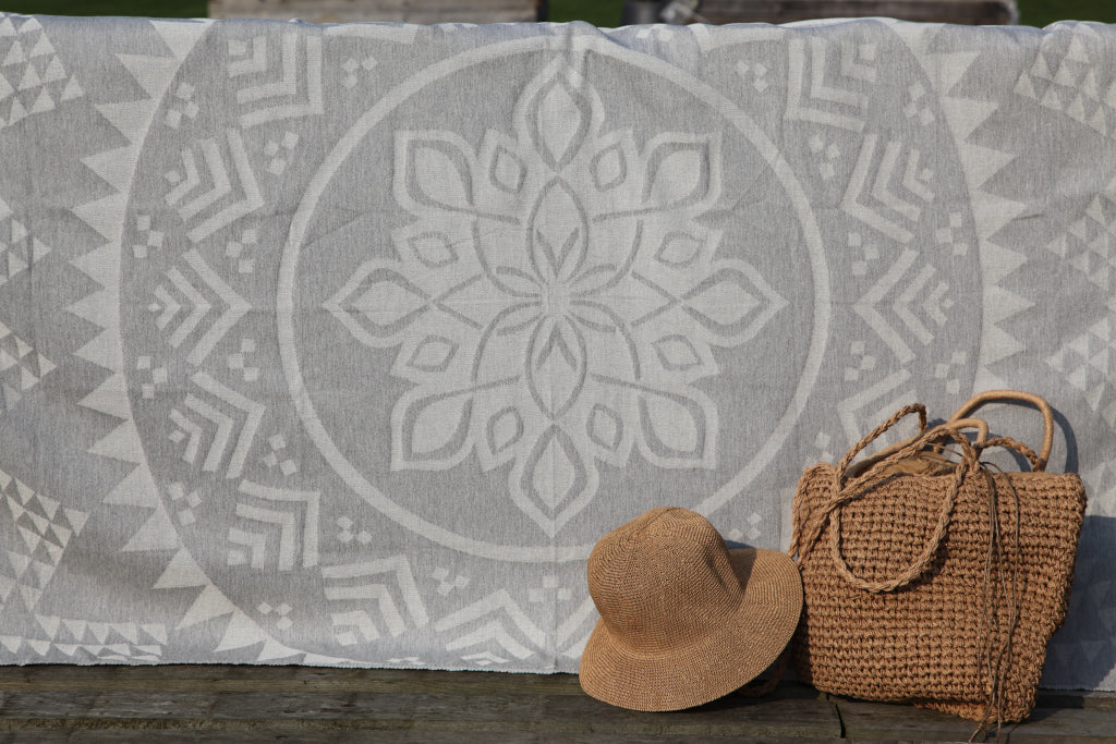Das Strandtuch HANNA hat ein Allover-Webmuster, welches an ein wunderschönes, zweifarbiges Mandala erinnert. Entspannung und Harmonie pur! Drømme!