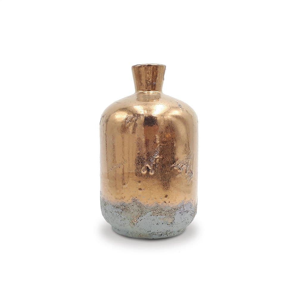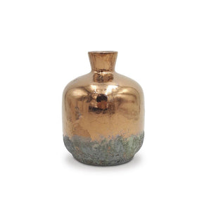 Diese wunderschönen Vintage-Keramikvasen in grau mit Kupfer metallic beschichtet sieht einfach edel aus. Der Vintage-Look macht sie sich toll auf dem Tisch, auch nur mit ein paar Gräsern. Mit unseren zwei weiteren Vasen aus dieser Serie ergibt sich eine schöne, stilvolle Deko-Kombination.