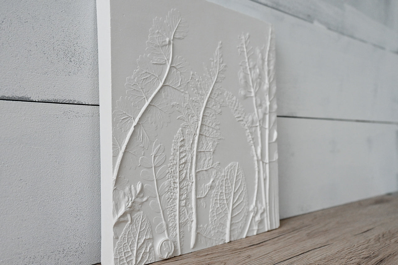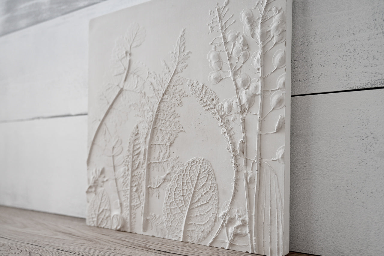 Wandkunst mit starker Reliefstruktur. Winter-Pflanzen 2021. Pure Elegance und Stärke strahlt das Wandbild aus.